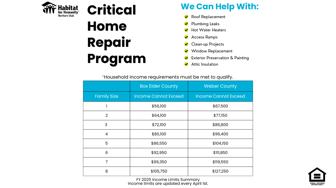 Homes must have a permanent foundation to be eligible for repair services. Due to program policy, Habitat for Humanity of Northern Utah cannot provide repairs for mobile homes or homes without a permanent foundation.